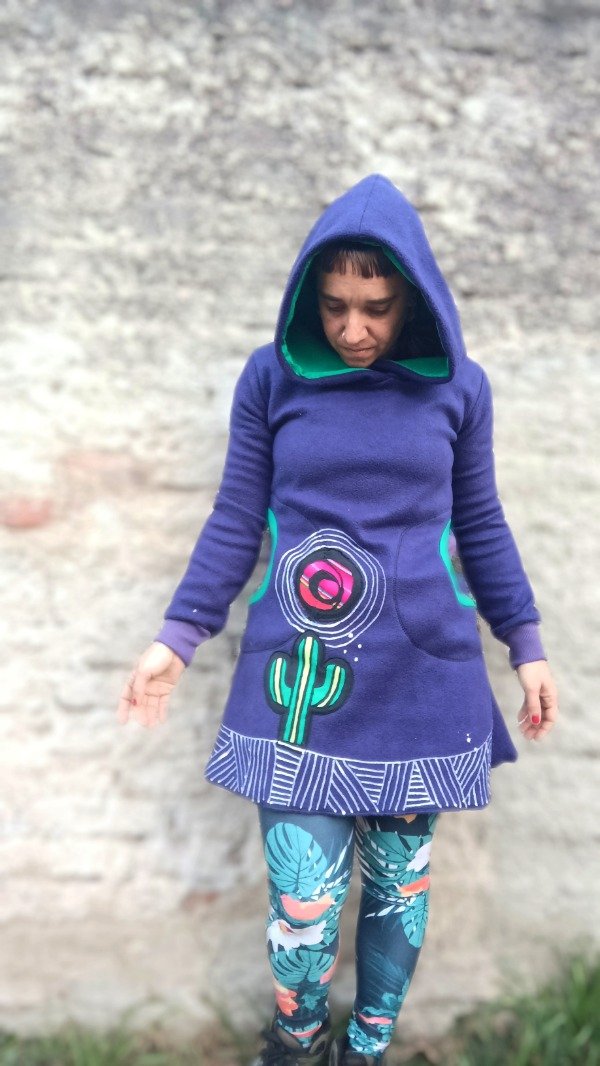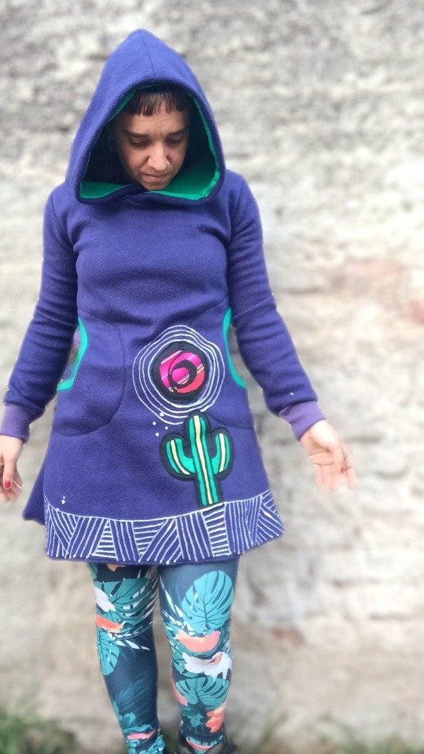 Vestido de tela de polar,corte evasé. La combinación perfecta entra un buzo y un vestidito. Huayra del quechua, significa viento. Para amigarnos con esos vientos frescos del otoño, invierno. Con capucha amplia, doble tela, Friza e interior de algodón de otro color. Bolsillos a la altura de la cintura. Mangas con puño de ribb ajustadito a la muñeca, que lo hace más abrigadito. Prenda de primera necesidad para los días fríos. Se puede usar con calzas, cancanes o pantalones.
