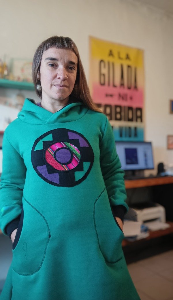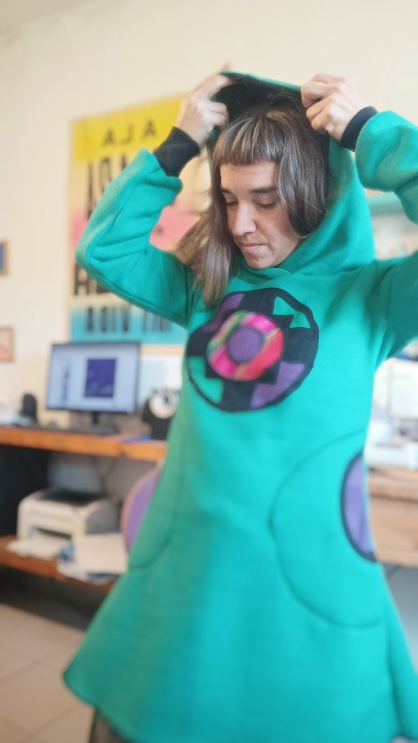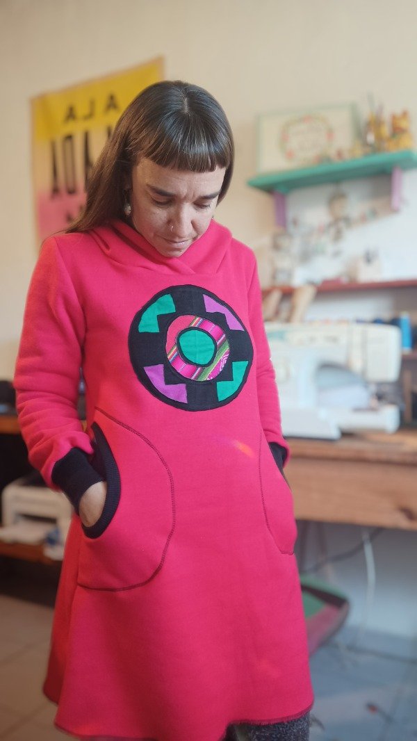Vestido de frisa de algodón,corte evasé. La combinación perfecta entra un buzo y un vestidito. Huayra del quechua, significa viento. Para amigarnos con esos vientos frescos del otoño, invierno. Con capucha amplia, doble tela, Friza e interior de algodón de otro color. Bolsillos a la altura de la cintura. Mangas con puño de ribb ajustadito a la muñeca, que lo hace más abrigadito. Prenda de primera necesidad para los días fríos. Se puede usar con calzas, cancanes o pantalones.